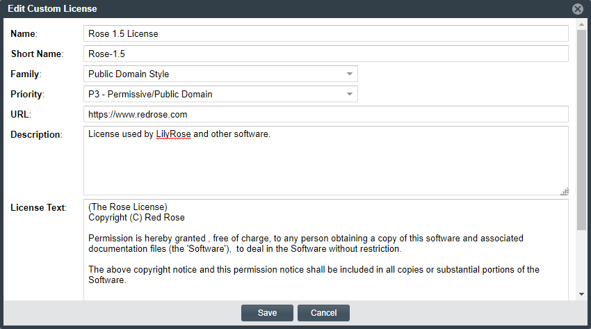 - From the Edit Custom License window, update the license properties as needed. For property descriptions, see Custom License Properties.