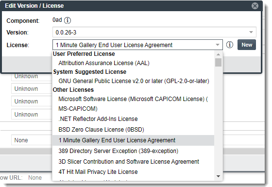 User Preferred and System Suggested LicenseA license (previously classified as System Suggested License ) that a user has specified to be mapped to all future inventory that the system generates across projects for the component version.