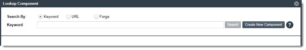 To search for a component, select the type of search you want to perform ( Keyword , URL , or Forge ), and enter the required search criteria. For information on these searches and the criteria you must enter for each, see Guidelines for Lookup Component Searches.